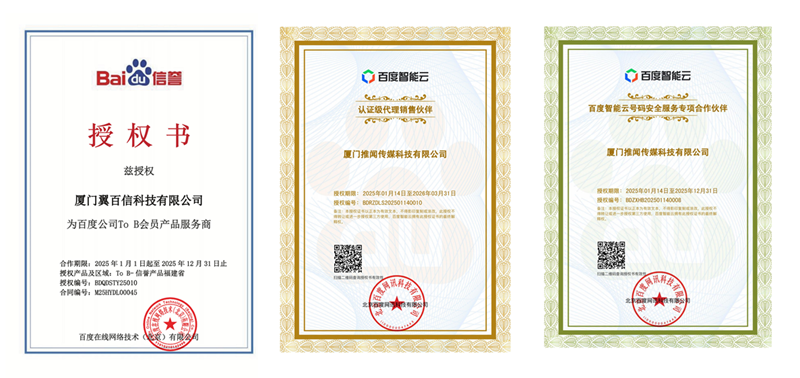 2022年 与百度合作,成为百度号码认证、百度智能云福建运营服务商,基于百度搜索和AI模型,在百度搜索结果展示企业专属认证,同时为企业用户提供搜索全场景覆盖,一站式解决所有号码需求;
